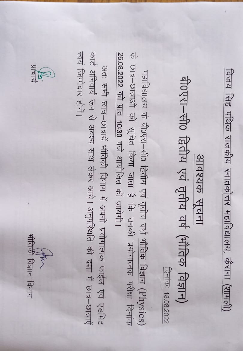 Dear students, Congratulations for choosing VSP Government PG College Kairana Family. I extend a warm greeting to you all on behalf of the College, a place where we appreciate youth and excellence and work to develop young people into virtuous citizens who are conscious of global challenges. In our college Students meet with broad spectrum of co-curricular and extracurricular activities and are trained for overall growth (Technical Education, Sports, Cultural, Social, Cooperative, skilled and Practical).